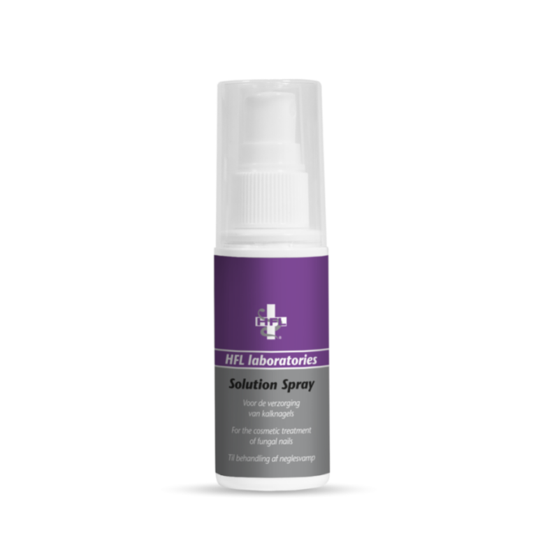 HFL Laboratories gepatenteerde Solution Spray is het product voor de cosmetische verzorging van kalknagels die vaak verkleurd of broos zijn. Solution spray draagt bij aan een gezonder uitziende nagel en ondersteunt en beschermt voor een optimaal herstel van de nagel. Mede daardoor kan de spray gebruikt worden op de huid. Bijvoorbeeld wanneer men de voeten of huid niet goed heeft afgedroogd na het douchen of zwemmen en de huid dus rood en gevoelig kan zijn geworden. De spray maakt de huid en nagels goed schoon.